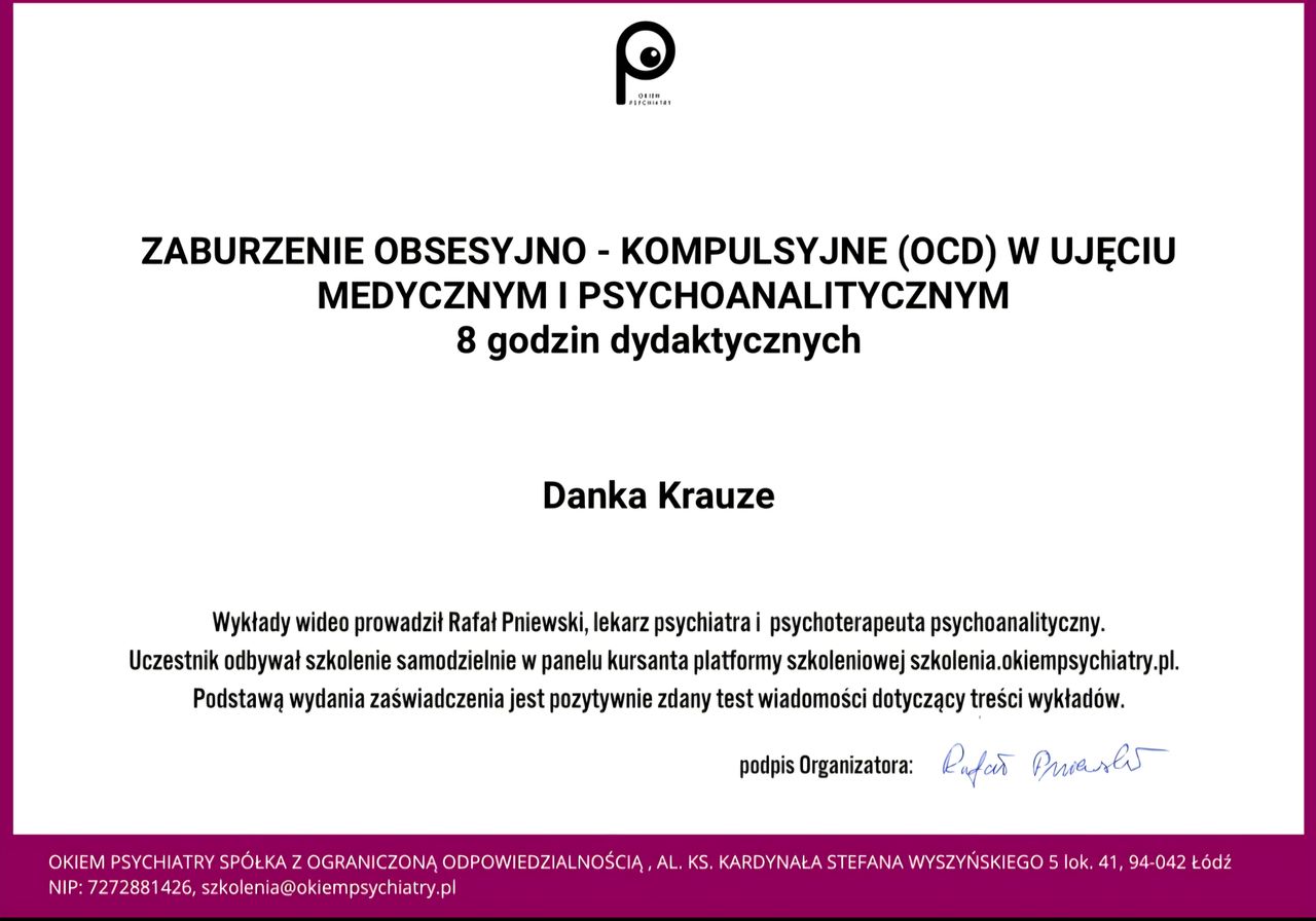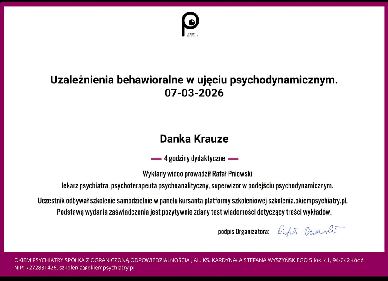 Jestem magistrem psychologii (specjalizacja kliniczna) na Uniwersytecie im. Adama Mickiewicza w Poznaniu i psychoterapeutą w trakcie szkolenia w czteroletniej szkole psychoterapii w nurcie integracyjno-systemowym, akredytowanej przez Polskie Towarzystwo Psychiatryczne i Polskie Towarzystwo Psychologiczne. Moje doświadczenie obejmuje staż w Poznańskim Ośrodku Zdrowia Psychicznego i prywatną praktykę jako psycholog, terapeuta i coach. Stale poszerzam swoją wiedzę i kompetencje, uczestnicząc w licznych kursach i szkoleniach.